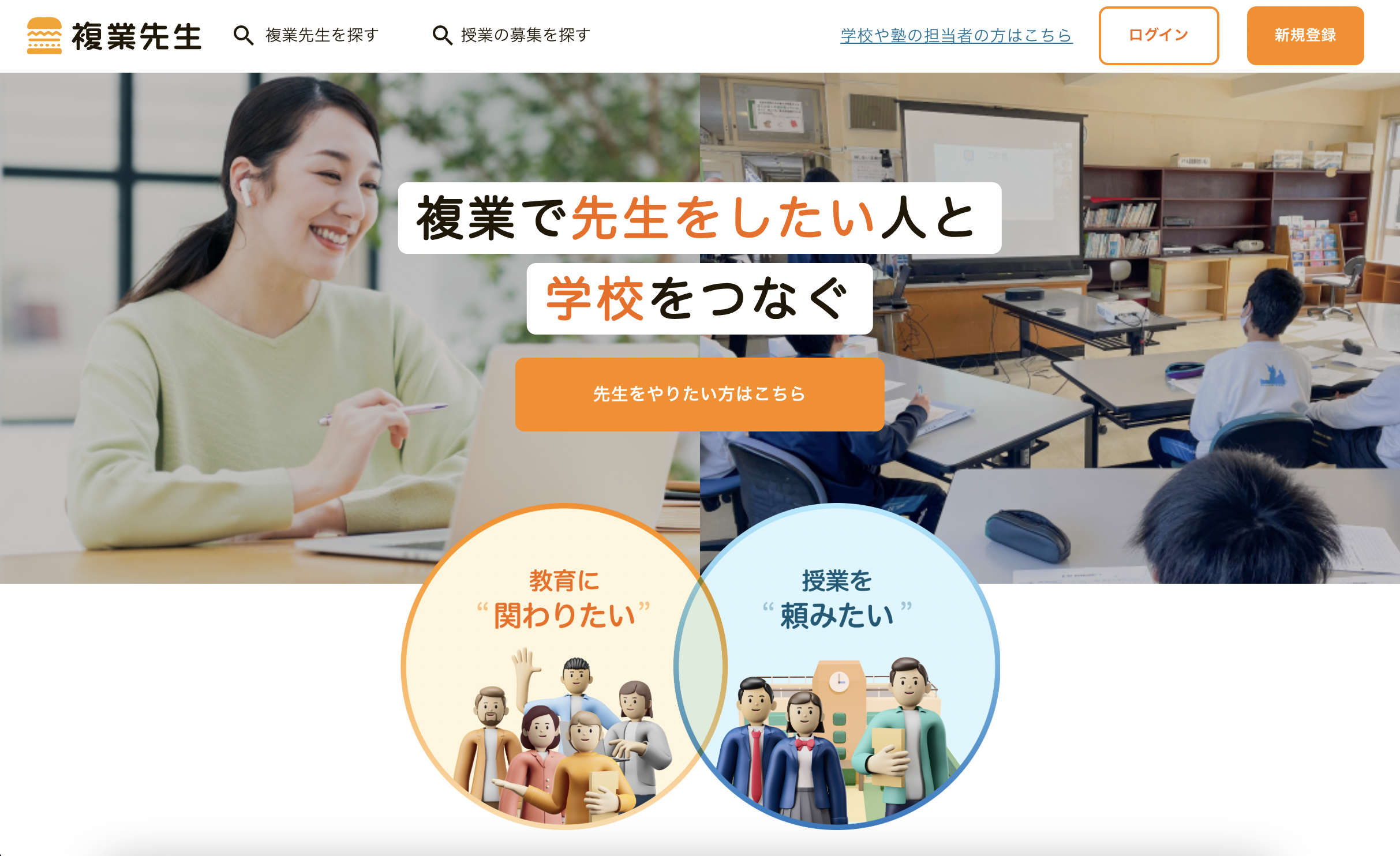 「複業先生」は、自分の知識・経験を生かして教育現場に携わりたい人材と、外部人材を活用した教育を行いたい教育現場をつなぐ教育特化型の外部人材活用サービス。専門性が求められるキャリア教育や探究学習、総合学習、プログラミング、グローバル、IT、起業、金融、性教育といった分野において、外部人材の専門知識を学校現場に導入できる。